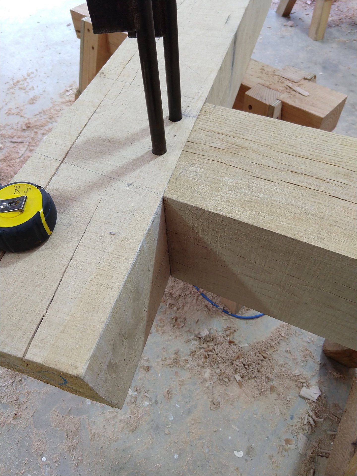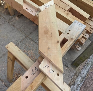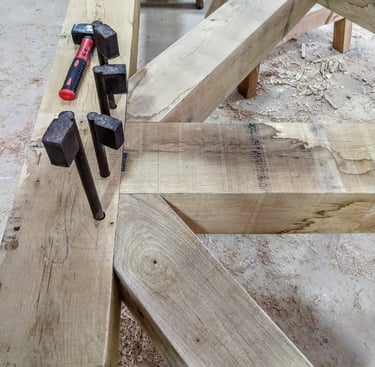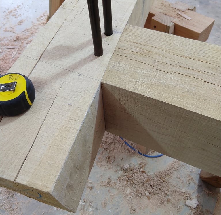 The first stage in fabricating the frame will be the scribe or layout of where all the joinery needs to go, and I will use a few common methods for this. Traditional scribe methods haven't changed for centuries and are incredibly accurate. When working with green timber, it is often imperfect or not square so scribe rule joinery using plumb bobs and very large dividers. Each timber is individually marked and cut and will only fit in its place within the assembly.
